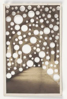 In this 'Postcard' series, Whiteread uses a hole punch to cut out negative spaces in the rooms, capturing the three-dimensional concerns of her sculptural form in a two-dimensional manner. The well-known touristic images are obscured by the cluster of circular abscesses, and they become ambiguous. More of Rachel Whitereads' drawings at the Tate Britain courtesy of the Guardian here, with accompanying article here.